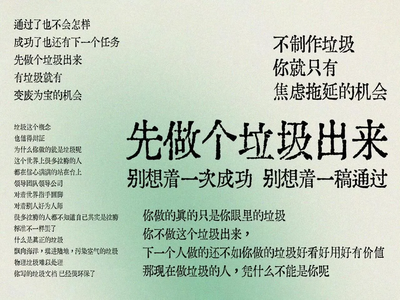 反思了一下,2024 年最大的主旋律还是“拖延”。希望 2025 新的一年能做到:管他什么情况,先做一坨垃圾出来再说