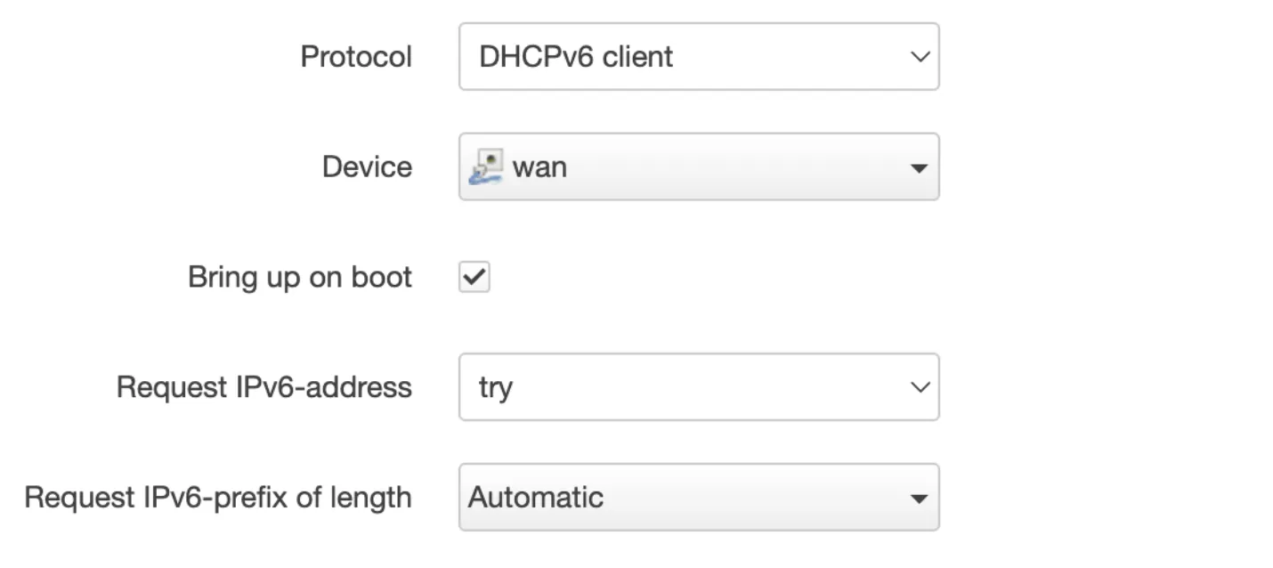 配置 WAN6 接口的两个设置:Request IPv6-Address 为 try,Request IPv6-prefix of length 为自动。