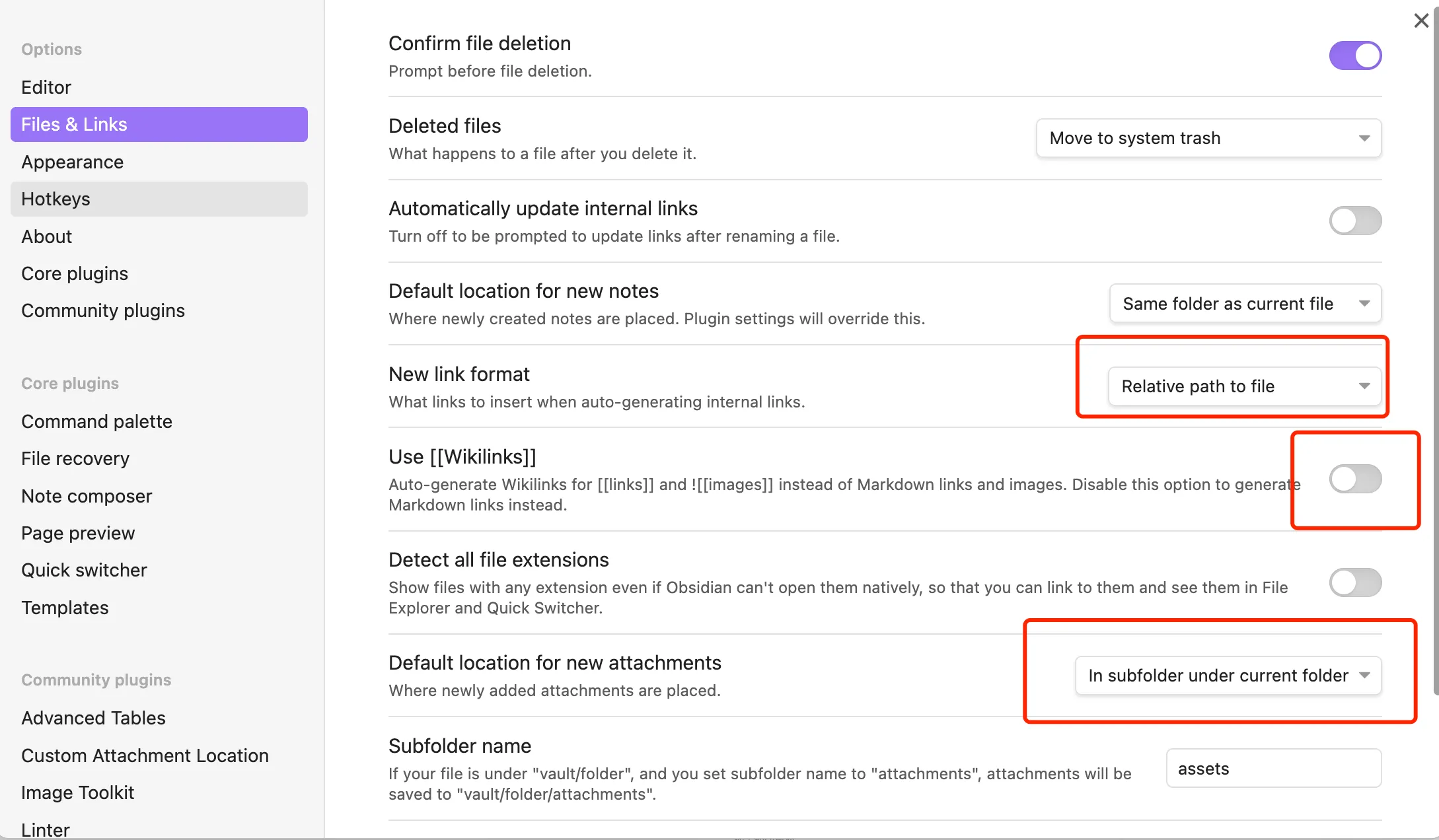 对于 Custom Attachment Location,设置如下。此时会将资源文件自动重命名,并保存到同层目录的 assets 文件夹。